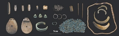 西藏康馬瑪不錯遺址第二期出土的遺物(石質(zhì)、骨質(zhì)、金屬裝飾品,骨針、滑石珠、紅玉髓等)。