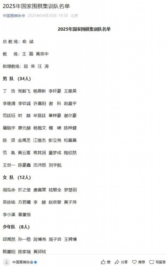 據(jù)國家圍棋集訓(xùn)隊選拔小組負(fù)責(zé)人介紹,根據(jù)《國家圍棋集訓(xùn)隊運(yùn)動員入隊標(biāo)準(zhǔn)》,報中國圍棋協(xié)會批準(zhǔn),共有54人入選2025屆國家集訓(xùn)隊。男隊由王星昊、丁浩、黨毅飛、楊鼎新、李軒豪、李維清、李欽誠等34名棋手組成;女隊有12人,包括周泓余、於之瑩、唐嘉雯等。此外,國少隊還有8名棋手。國家圍棋集訓(xùn)隊的教練組由5人組成,俞斌擔(dān)任總教練,王磊、黃奕中擔(dān)任教練,段榮和汪濤任助理教練。