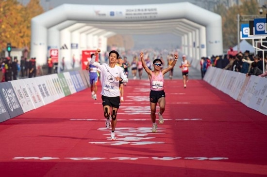 2024年11月3日,2024北京馬拉松賽暨全國馬拉松錦標賽(第3站)在京舉行。參賽選手沖向位于奧林匹克公園的終點線。新華社記者 陳鐘昊攝