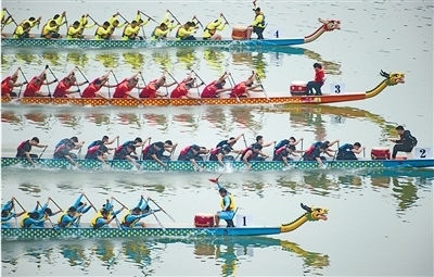 “比賽項目很豐富,有200米、500米直道賽以及搶紅奪標賽,今年還新設了龍舟拔河?!惫ふf,傳統(tǒng)的龍舟一般坐22個人,現(xiàn)在比賽用的小龍舟通常坐12個人。