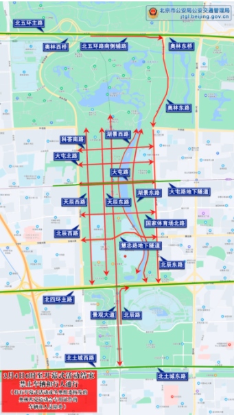 三、14時(shí)至開幕式結(jié)束,北辰西路、奧林西路、奧林東路南向北方向主輔路、北辰東路南向北方向主輔路、民族園路,除持有開幕式或冬奧組委核發(fā)的奧林匹克運(yùn)動(dòng)會專用證件的車輛和人員外,禁止其他車輛和行人通行。社會車輛和公交車可經(jīng)安立路、安定路、京藏高速公路、北土城西路、北土城東路繞行。