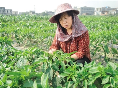 王秀芝在田里查看辣椒長勢。
