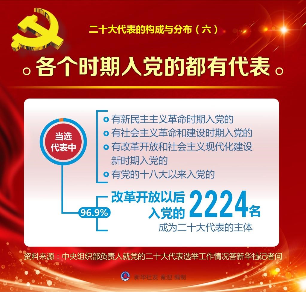 六是各個(gè)時(shí)期入黨的都有代表。當(dāng)選代表中,有新民主主義革命時(shí)期入黨的,有社會(huì)主義革命和建設(shè)時(shí)期入黨的,有改革開放和社會(huì)主義現(xiàn)代化建設(shè)新時(shí)期入黨的,有黨的十八大以來入黨的。其中,改革開放以后入黨的2224名,占96.9%,成為二十大代表的主體。