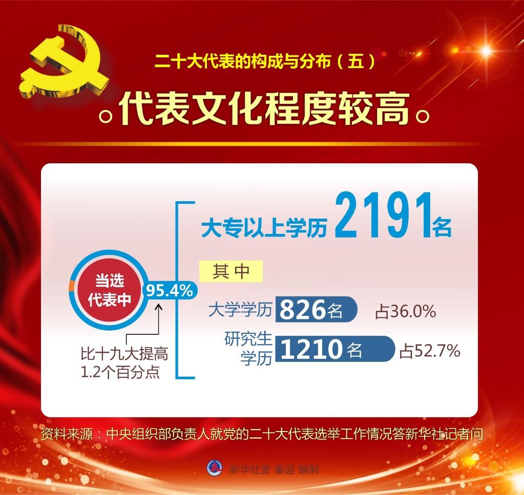 五是代表文化程度較高。當(dāng)選代表中,大專以上學(xué)歷的2191名,占95.4%,比十九大提高1.2個(gè)百分點(diǎn)。其中,大學(xué)學(xué)歷的826名,占36.0%;研究生學(xué)歷的1210名,占52.7%。