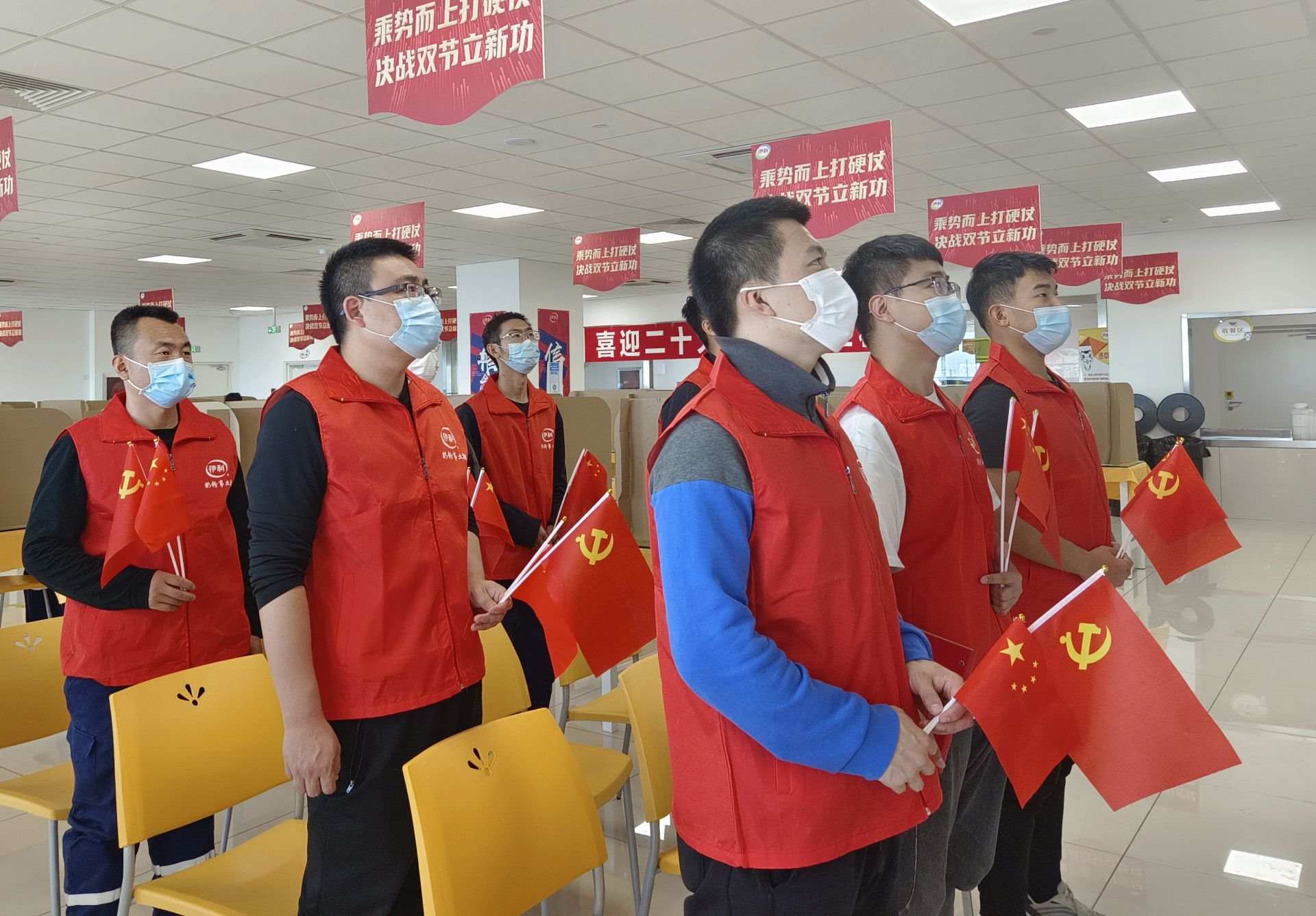 中建三局呼和浩特建設(shè)項(xiàng)目施工人員收看黨的二十大開幕會(huì)。曹楨攝