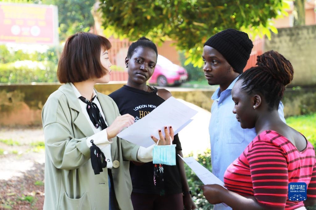 2022年4月19日,在烏干達首都坎帕拉,麥克雷雷大學(xué)孔子學(xué)院中文教師王夢云(左)與學(xué)生進行交流。新華社記者張改萍攝