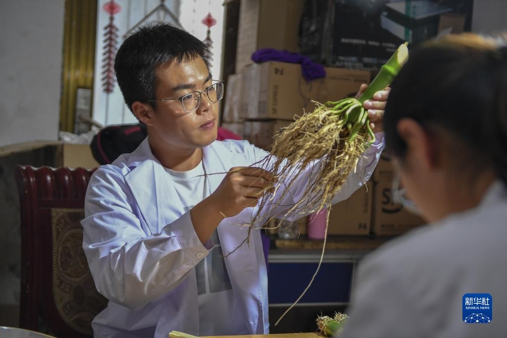 2021年8月2日,在吉林省梨樹縣四棵樹鄉(xiāng)三棵樹村“科技小院”,中國(guó)農(nóng)業(yè)大學(xué)學(xué)生沙野查看玉米根系樣本。新華社記者 張楠 攝