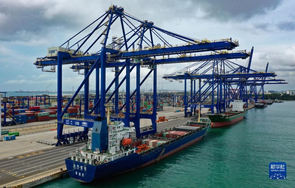 6月15日,集裝箱貨輪在海南洋浦國(guó)際集裝箱碼頭裝卸貨物(無(wú)人機(jī)照片)。新華社記者 郭程 攝