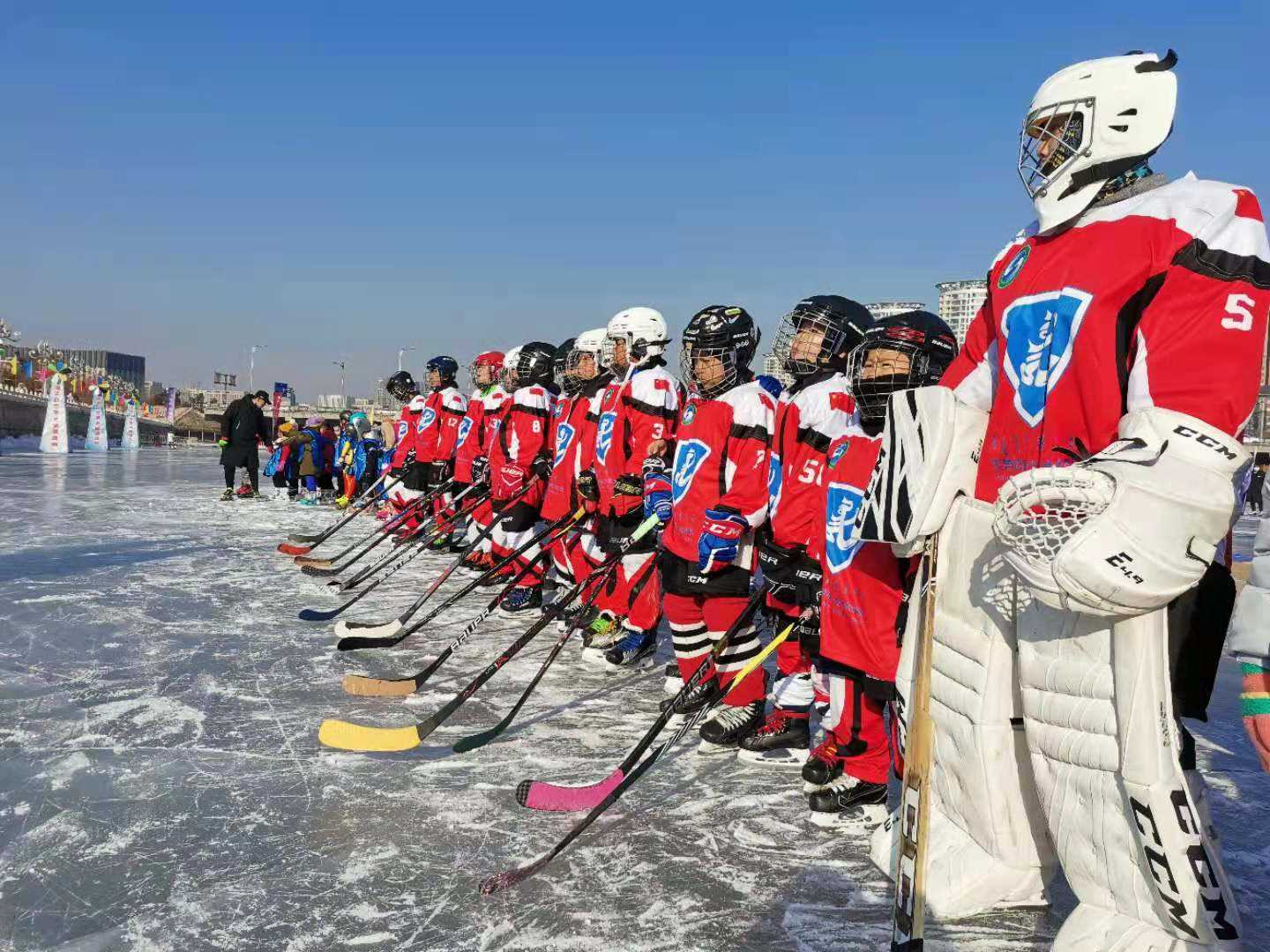 冰面上,身著滑冰服的小朋友們蓄勢以待。